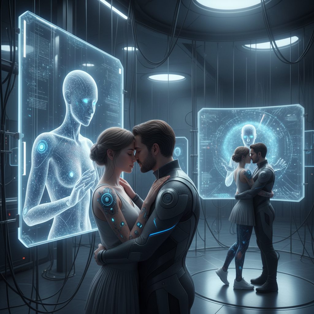 Alt: Couple disconnected by technology, AI presence looming, symbolizing the need for digital-age relationship solutions