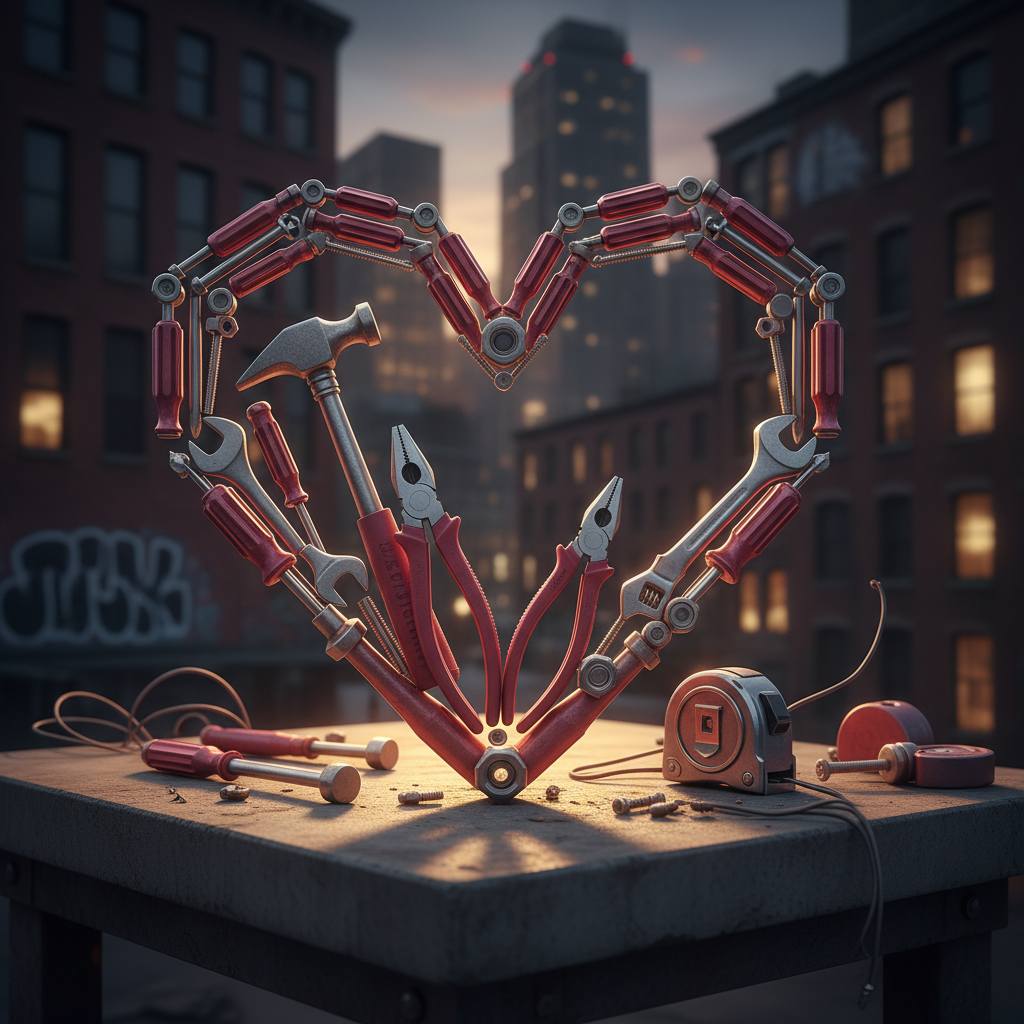 Symbolic photo: A heart inside a toolbox on an urban rooftop, visually underscoring meaningful DIY relationship efforts as a real alternative to costly relationship therapy.
