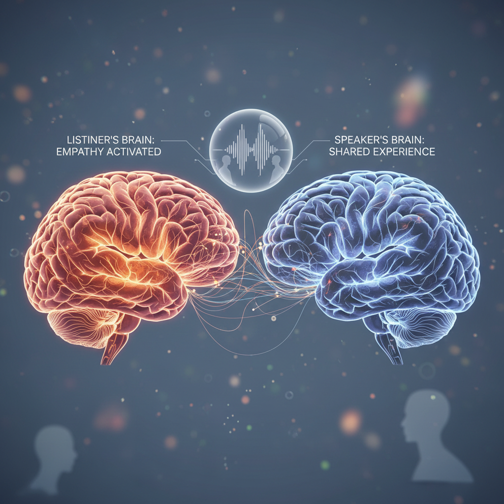 Alt text: Artistic image of brain activity during empathetic listening, neon colors, constructive conversation keywords