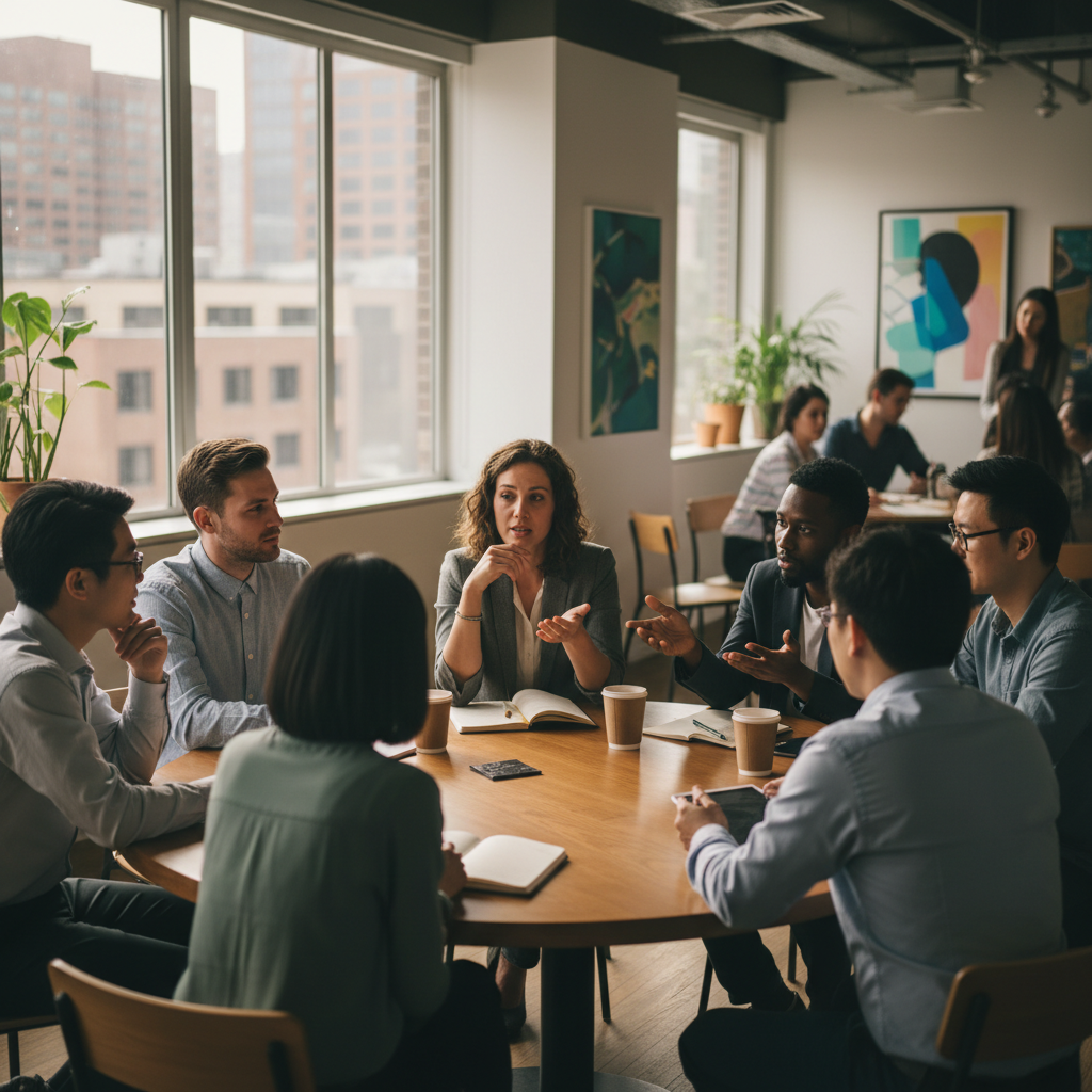 Alt text: Multicultural group at table navigating discussion styles, constructive conversations, conflict resolution