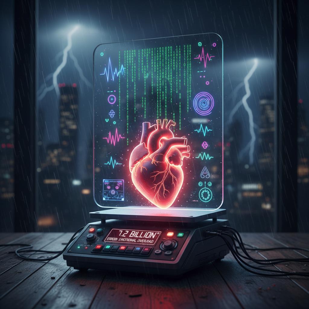 Conceptual, editorial photo: Digital scales balancing heart and code, dramatic lighting, symbolic.