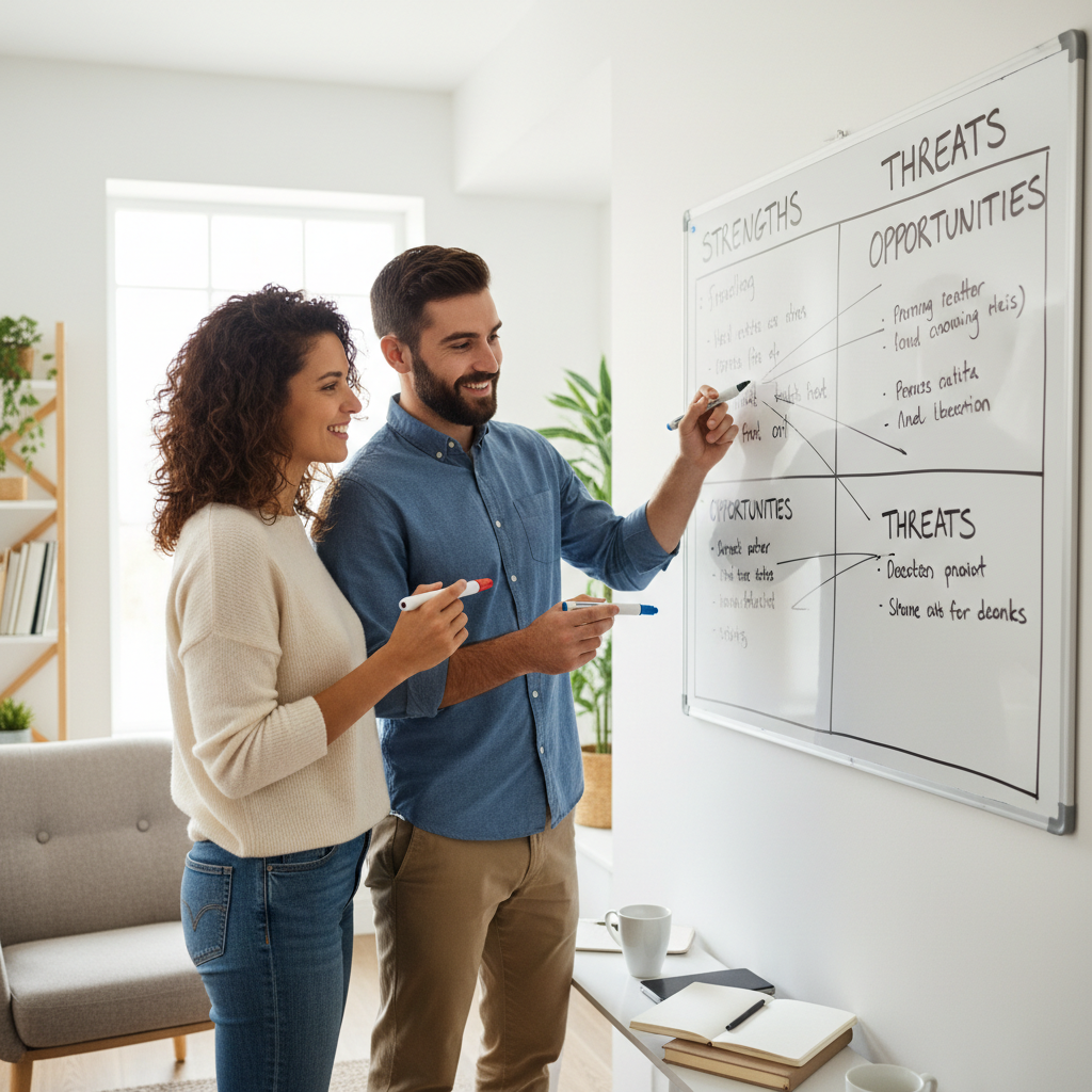 Business tools aren’t just for boardrooms. A SWOT analysis (Strengths, Weaknesses, Opportunities, Threats) can clarify big relationship decisions—like moving cities, opening the relationship, or merging finances. Sit down with your partner (whiteboard optional), and map out each quadrant honestly. The process itself often reveals more than the results.