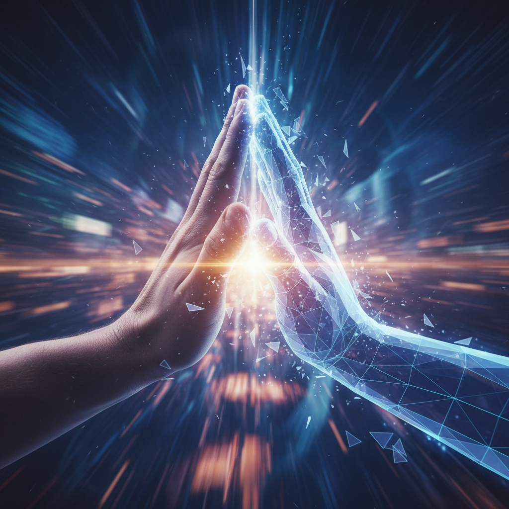 Alt text: Human hand and digital hand high-fiving, symbolizing collaboration with your AI coach for better relationship results.