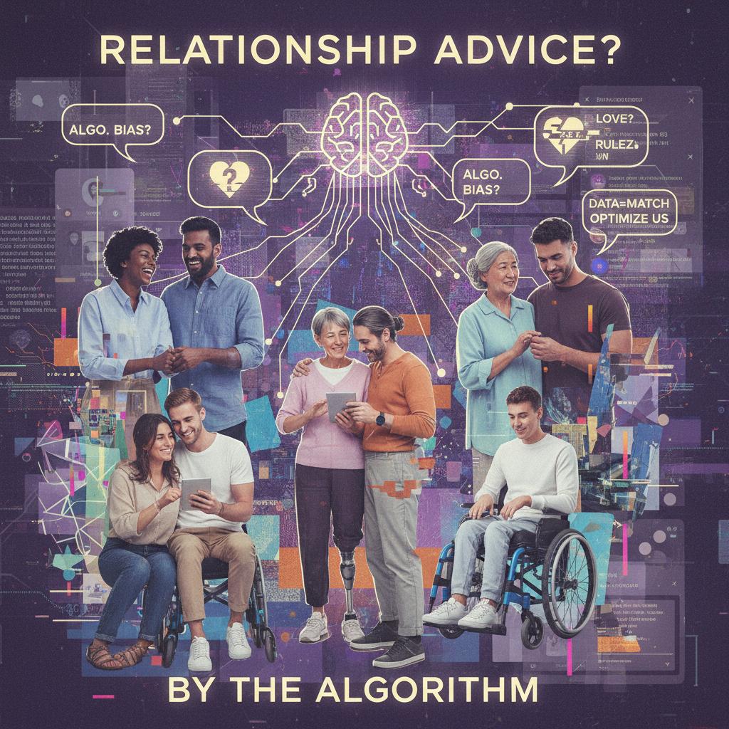 Alt: Diverse couples blurred in a digital collage, representing algorithmic bias and diversity challenges in online relationship advice platforms.