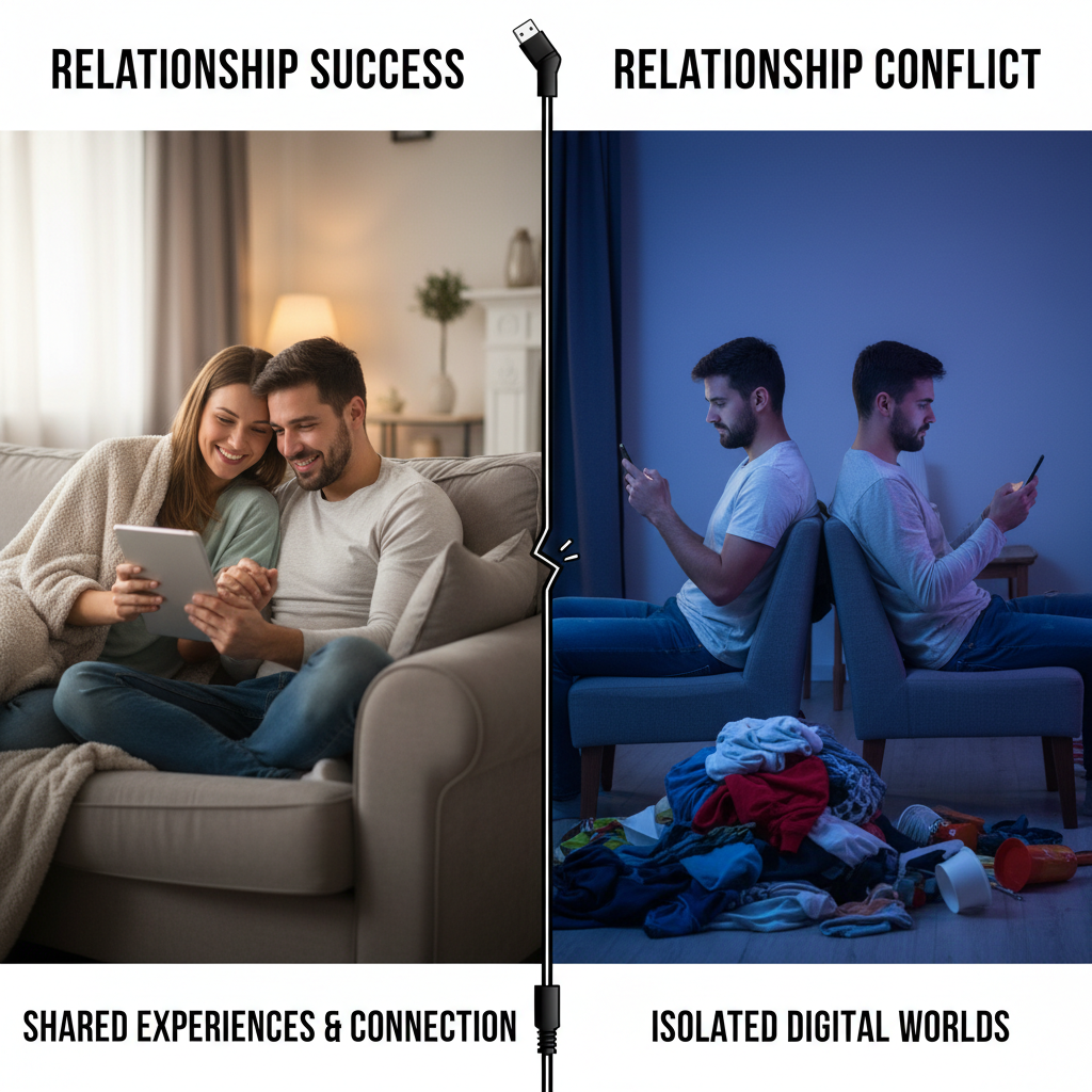 Alt text: Couples using devices, split-screen with one celebrating and one arguing, illustrating online relationship resource outcomes