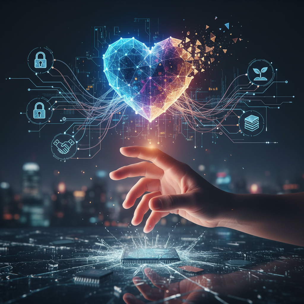 Alt text: Human hand reaching toward glowing digital heart, symbolizing connection and risk in online relationship resources