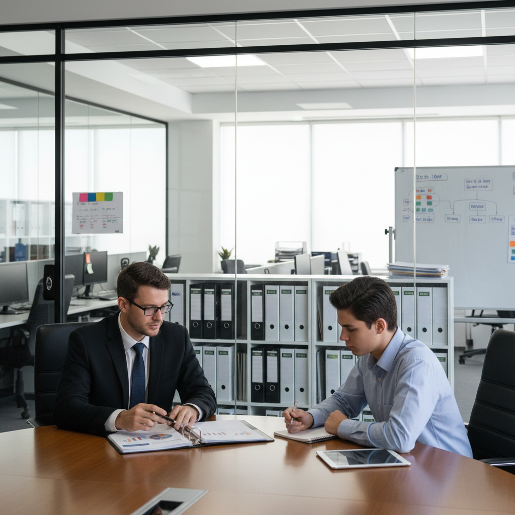 Alt text: Relationship professional providing structured guidance in a modern office with subtle edgy details.