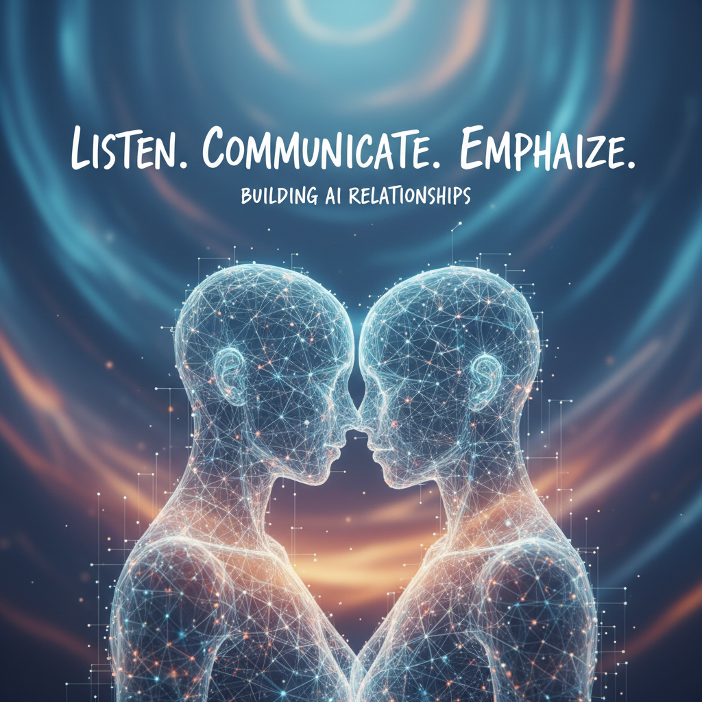 Alt: AI and human silhouettes discussing relationship advice, neutral unbiased guidance