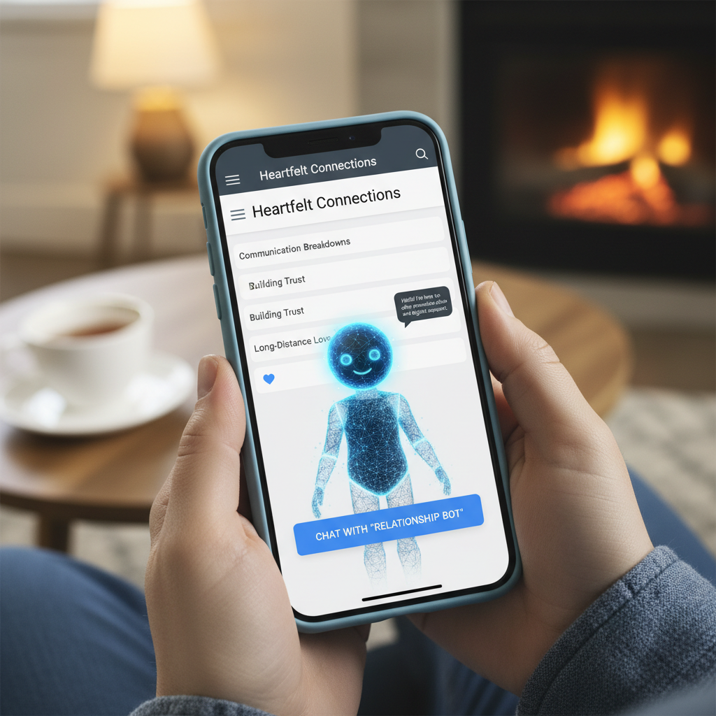 Image: Futuristic depiction of a human conversing with an AI assistant in a cozy home. Alt: Person seeking relationship advice from an AI.