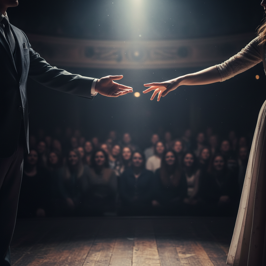 Image: Artistic shot of two hands reaching for each other across a stage lit with spotlights. Alt text: Two people reaching out amid stage lights, symbolizing distance and connection.