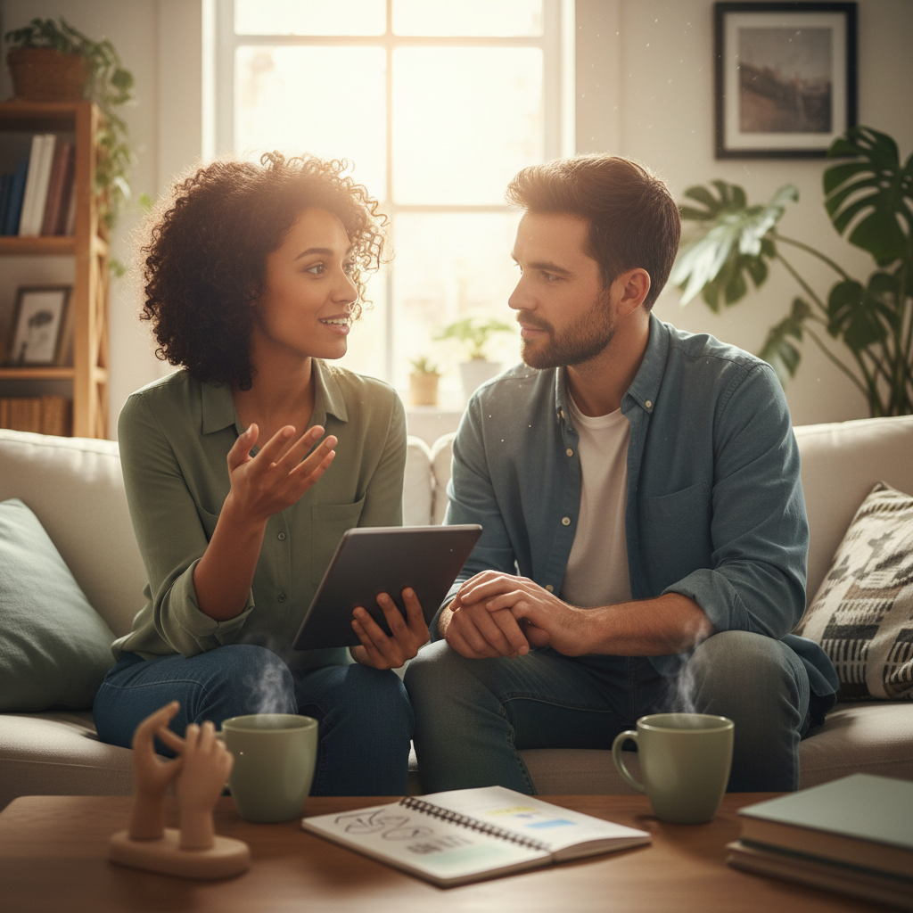 Couple using AI relationship coach in living room for advanced problem solving techniques.