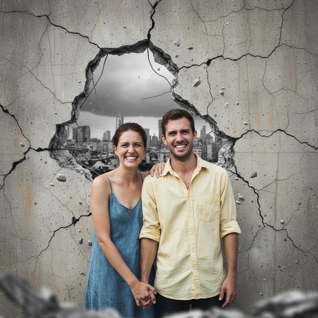Photo of a couple smiling with visible cracks in a painted wall behind them, illustrating the facade of positivity hiding relationship fractures.