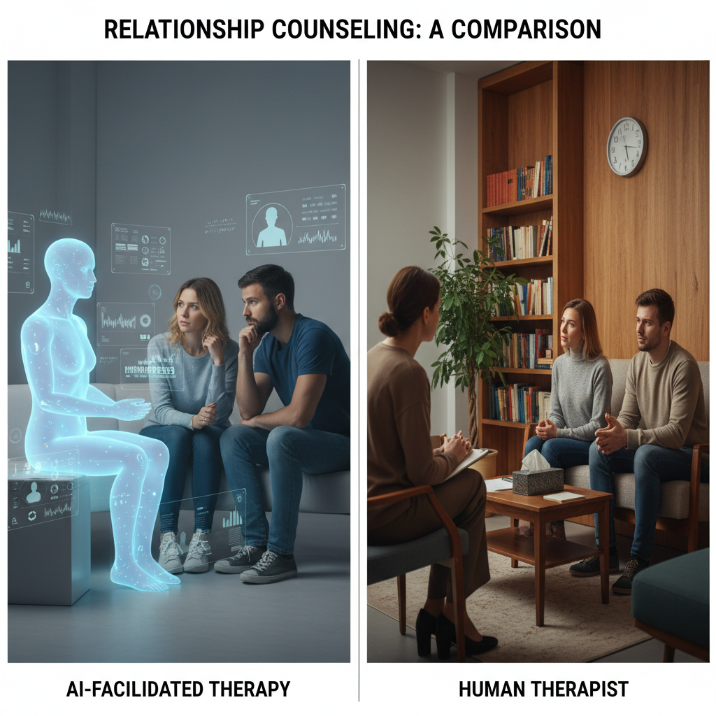 Alt text: Comparing AI and human relationship counseling in a split-screen photo with visible digital interface and human therapist