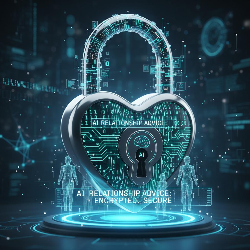 Alt: Data security concerns with AI relationship advice, heart-shaped lock surrounded by binary code, digital privacy
