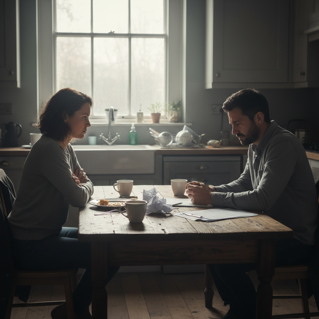 Two people in a tense relationship conversation at home, embodying the struggle to explain relationship problems honestly.